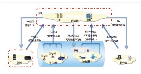 中興通訊增強(qiáng)端到端信息感知和開放接口,提出一套標(biāo)準(zhǔn)架構(gòu)如圖2所示,來實(shí)現(xiàn)整個(gè)網(wǎng)絡(luò)透明、可視。建設(shè)網(wǎng)絡(luò)信息采集體系,增強(qiáng)感知云的端到端分析能力;建立“桌面云-感知云”的云端一體化架構(gòu),提供網(wǎng)絡(luò)推送能力;感知云向終端開放網(wǎng)絡(luò)信息和能力,增強(qiáng)用戶感知網(wǎng)絡(luò)、定制個(gè)人體驗(yàn)?zāi)芰;感知云向業(yè)務(wù)開放網(wǎng)絡(luò)信息和能力,拓展合作發(fā)展增值業(yè)務(wù)的能力。