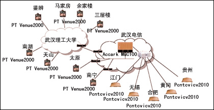 武漢理工大學的遠程教學系統(tǒng)由于分2期建設,網(wǎng)絡條件較為復雜。一期主要以PT的Venue2000終端+Accord MGC100 MCU為主,是H.323系統(tǒng);二期采用Penteview2010終端+Penteview6088MCU,是H.320系統(tǒng),此案例是國內首家教育行業(yè)H.320與H.323混合組網(wǎng)方式的視頻電視遠程教學網(wǎng)。各教室均采用了中太數(shù)據(jù)的遠程教學中控系統(tǒng),整個組網(wǎng)采用星型結構,2010和6088之間采用512k的DDN專線連接,其中,384k用于傳輸視頻、音頻,128k用于傳輸T.120數(shù)據(jù)。2010設備及其標準外設,加上符合遠程教育功能需要的其他外設,構成遠程教育網(wǎng)絡專用教室的設備配置。