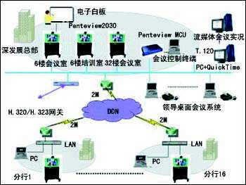 中太數(shù)據(jù)為深圳發(fā)展銀行構建的視頻會議項目,是為深圳發(fā)展銀行在已有的DDN網(wǎng)絡的基礎上,構建的一個全國性的會議電視平臺。通過這個平臺,使跨地域的溝通更加經(jīng)濟、高效和靈活。針對深發(fā)展的網(wǎng)絡實際情況以及會議電視的發(fā)展方向,方案中采用基于MPEG-4的Penteview2030產(chǎn)品,支持H.323的MCU Penteview 6182,以及Penteview數(shù)據(jù)會議服務器。整個深發(fā)展會議電視系統(tǒng)組網(wǎng)分為兩級,中心點3套Penteview 2030到下面的16個異地的分支行。深圳發(fā)展銀行大廈6樓大會議室、培訓小會議室、32樓會議室作為主會議室,在6樓的機房中放置主MCU和一個終端,培訓小會議室放置一個終端,其他16個異地分支行分別放置一臺Penteview2030終端,通過現(xiàn)有的深發(fā)展DDN網(wǎng)絡相互連通。根據(jù)深發(fā)展通信網(wǎng)絡結構及傳輸容量的實際情況,該系統(tǒng)采用星型拓撲連接,各地可通過現(xiàn)有的DDN劃出768k-2M的帶寬,以視頻會議的方式組建起多點會議電視系統(tǒng)。各會場通過PC機實現(xiàn)數(shù)據(jù)會議功能。