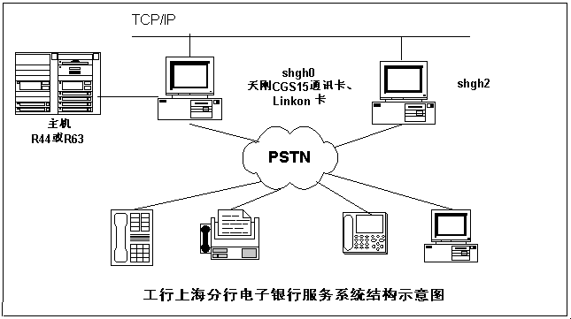 該系統(tǒng)以IBM提供的 R63和R44主機(jī)為中心,一臺(tái)Unix通信前置機(jī)通過CGS15通信卡與主機(jī)相連。該前置機(jī)與另一臺(tái)前置機(jī)連成局域網(wǎng),對(duì)外提供74線語音、傳真和MODEM服務(wù)。今后隨著業(yè)務(wù)的增長(zhǎng),可以通過增加通信前置機(jī)方式,增加對(duì)外服務(wù)線路,從而使系統(tǒng)具有良好的開放性和擴(kuò)展能力。