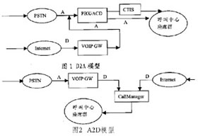 A2D法(Analog to Data) A2D法即事先將呼入呼叫中心的DTMF電話通過VoIP網(wǎng)關轉(zhuǎn)化為IP電話,再和來自Internet的IP電話一同接入座席代表。A2D法實現(xiàn)相對比較麻煩,但其將絕大部分工作放到計算機網(wǎng)絡這個開放的軟件平臺來做,除了有利于更新和開發(fā)外,還能降低成本。同時,這種結(jié)構(gòu)能在地理上和物理上伸縮自如,不僅便于高度集成,而且便于跨地區(qū)構(gòu)建。