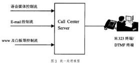 目前,IP Call Center實現(xiàn)綜合媒體統(tǒng)一處理的方式已取得比較一致觀點,即如圖3的語音媒體流和IP傳真、Web主頁、Email進入座席群前先經(jīng)過一個服務軟件進行統(tǒng)一處理,該服務軟件一般廠家都稱為Call Center Server(簡稱CCS服務器),它起著完成呼叫控制、路由處理、與呼叫同步的用戶數(shù)據(jù)管理及信息監(jiān)視等作用。