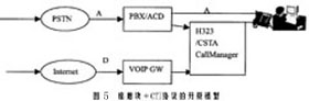 比較有代表性的解決方案有兩種,一種是效仿圖1的做法,在ACD的用戶側(cè)加入VoIP網(wǎng)關,再統(tǒng)一接入(如圖4所示);另一種方法是采用價格比較便宜的IP座席卡,并在Call Manager中加入CTI的有關協(xié)議模塊(如圖5所示)。