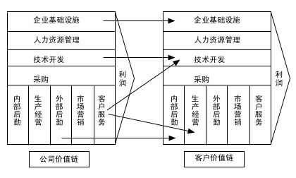 企業(yè)的主要活動(dòng)都是具有相應(yīng)價(jià)值的,這些活動(dòng)構(gòu)成了企業(yè)的價(jià)值鏈,企業(yè)價(jià)值鏈?zhǔn)紫缺憩F(xiàn)為企業(yè)內(nèi)部的聯(lián)系和支撐,各種活動(dòng)相互配合,才能產(chǎn)生價(jià)值和利潤(rùn);其次,企業(yè)的活動(dòng)和上游供貨商和下游用戶(hù)緊密聯(lián)系,相互影響。顯然,供貨商、用戶(hù)的各種活動(dòng)方式能夠直接或者間接地影響企業(yè)的成本、利潤(rùn)和競(jìng)爭(zhēng)優(yōu)勢(shì),同樣,企業(yè)的各種活動(dòng)也將對(duì)它們產(chǎn)生很大的影響。