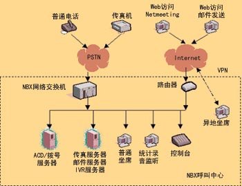 NBX網(wǎng)絡(luò)呼叫中心的核心是3Com公司的NBX網(wǎng)絡(luò)電話交換機(jī),它具有PBX的功能,支持多種外線接入方式,呼入的語(yǔ)音信號(hào)轉(zhuǎn)換為數(shù)據(jù)包,在局域網(wǎng)內(nèi)部傳輸,實(shí)現(xiàn)局域網(wǎng)內(nèi)部語(yǔ)音、數(shù)據(jù)的統(tǒng)一。坐席可以延伸到數(shù)據(jù)網(wǎng)可以達(dá)到的地方(適當(dāng)?shù)膸挘,而不受地理位置的限制。你可以通過(guò)申請(qǐng)各類(lèi)專(zhuān)線,如VPN、DDN等,將計(jì)算機(jī)連入呼叫中心,實(shí)現(xiàn)分地域、分種類(lèi)、分?jǐn)?shù)據(jù)的服務(wù)。NBX網(wǎng)絡(luò)呼叫中心擴(kuò)大了對(duì)外服務(wù)方式,通過(guò)上網(wǎng)訪問(wèn)企業(yè)主頁(yè),并使用Windows集成的Netmeeting軟件通過(guò)使用電腦的聲卡、耳機(jī)、麥克風(fēng)直接與服務(wù)代理人員進(jìn)行語(yǔ)音交流。