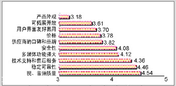 通過各項(xiàng)指標(biāo)重要性評價(jià)指數(shù)的綜合比較,可以看到,在視頻會議終端系統(tǒng)選型中對用戶而言偏向非常重要4.5≤Y≤5的指標(biāo)為視、音頻質(zhì)量。由于視頻質(zhì)量的局限性會損害運(yùn)動(dòng)圖像的質(zhì)量,導(dǎo)致視頻不自然,同時(shí)容易導(dǎo)致用戶產(chǎn)生“音頻疲勞”。所以用戶普遍關(guān)注視頻音頻質(zhì)量,希望得到盡可能真實(shí)的效果。視音頻的質(zhì)量是視頻會議終端系統(tǒng)最為根本的要求,這反映用戶對產(chǎn)品最為基本的功能質(zhì)量十分看重。