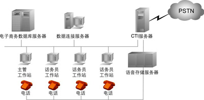 中型呼叫中心:座席代表在50~100之間。據(jù)專業(yè)數(shù)據(jù)統(tǒng)計(jì)公司預(yù)測,中型系統(tǒng)需求量最大,因此不少呼叫中心軟、硬件開發(fā)商對準(zhǔn)這一目標(biāo)進(jìn)行開發(fā)。這種系統(tǒng)結(jié)構(gòu)相對簡單,投資也少,容易被中、小企業(yè)所接受。目前我國的一些公司開發(fā)系統(tǒng)多屬于此種類型。它可以省掉大型交換機(jī)的投資,而利用PBX與CTI服務(wù)器和業(yè)務(wù)代表座席直接相連,業(yè)務(wù)代表席同時(shí)與應(yīng)用服務(wù)器相連,客戶資料也存在應(yīng)用服務(wù)器中,可實(shí)時(shí)地將接入電話的客戶姓名自動(dòng)在計(jì)算機(jī)屏幕上彈出。CTI服務(wù)器一般由CTI硬件開發(fā)商的板卡和PC組成,其擴(kuò)容和增加功能也比較方便,成本也低,因此是一種投資小、見效快、升級(jí)也很靈活的系統(tǒng)。