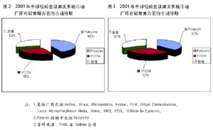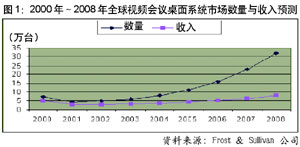 2002年年初,在IDC預(yù)測的本年度IT業(yè)界熱點技術(shù)中,視頻會議技術(shù)位居前列。而根據(jù)通信專業(yè)領(lǐng)域著名獨立研究機構(gòu)Wainhouse 的一份調(diào)查報告,2001年全球視頻通信領(lǐng)域僅設(shè)備市場,容量就達到近6億美元,占整個視頻會議市場52%的份額。Wainhouse還指出,2002年是視頻會議領(lǐng)域發(fā)展極為迅猛的一年,估計到2006年,整個視頻會議市場的市場容量將達到29億美元,比2001年增長20.4%。