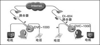 Modem上。圖1通過DI-604路由器與DSL Modem連接,實現(xiàn)與Internet互聯(lián)。DVC-1000還配備了一個電話機接口,可以外接一部普通電話機作為話音交流和撥號設(shè)備。