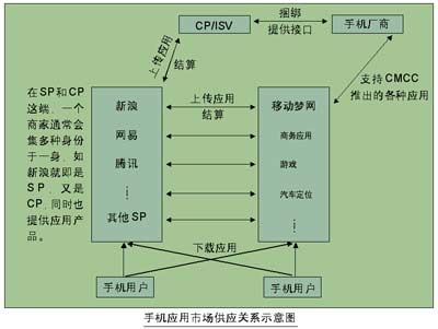 在這樣一個(gè)全新的銷售模式下,運(yùn)營商的作用也越發(fā)凸顯出來!皦艟W(wǎng)是一個(gè)大的平臺,SP是個(gè)小平臺,SP再通過與CP建立合作,進(jìn)而將整個(gè)應(yīng)用市場與終端連接起來,F(xiàn)在,我們?nèi)康膽?yīng)用都放到夢網(wǎng)上面了。”北京報(bào)童電子商務(wù)公司的一個(gè)工作人員說。移動夢網(wǎng)的建立,事實(shí)上在手機(jī)廠商、應(yīng)用開發(fā)商、用戶三者之間搭了一個(gè)橋梁,將各種手機(jī)應(yīng)用集中在一個(gè)門戶網(wǎng)站,用戶需要時(shí),只需登陸到夢網(wǎng)上面,點(diǎn)擊相關(guān)的網(wǎng)頁,就可隨時(shí)下載所需要的應(yīng)用。