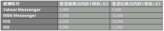 在使用Windows平臺下的PC也只有內存還稍顯珍貴,所以就這四款軟件所占用的內存進行了對比。結果如下:Yahoo! Messenger所占的內存,無論在登錄前后都是最小的;第二名,MSN Messenger在功能龐大的情況下,能做得如此精巧實屬難得;第三名,ICQ從2000版開始對內存的占用始終比較穩(wěn)定,只是在出了中文界面后稍高一些;第四名,QQ啟動出現(xiàn)登錄界面時還沒顯出味口有多大,不想登錄后隨著系統(tǒng)信息和Flash廣告等傳到客戶端占用內存的峰值竟然能達到15,000K,相信內存小一些的機器在QQ登錄后就要多等一會兒了。