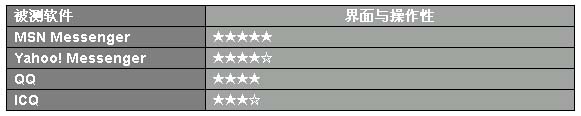 對于IM類軟件來說,網(wǎng)友希望其界面在精美的同時越簡單越直接越好。在這一點上,MSN Messenger最為突出,界面精致,操作極易上手,在本次評測中獲得一致認可,位列第一;Yahoo! Messenger操作上也比較直觀,只是“做工”顯得有些粗糙;被測的QQ2003剛剛在界面上做了重大的改變,只是稍顯零亂,對MSN的部分借鑒比較成功,對于一個新用戶來說最基本的功能的使用還算方便;ICQ功能的確強大,界面有些老舊,(ICQ Lite可以改變這一切,但是ICQ Lite僅僅是ICQ的一個插件版本,本次評測沒有考慮),ICQ操作對中文用戶來說也過于繁復。