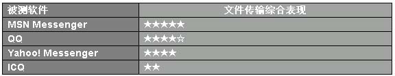 評測傳輸結果表明,MSN Messenger 6.0穿防火墻的能力很強,而且傳輸速度還不錯;QQ的速度與MSN Messenger相當,但防火墻穿越能力和傳輸穩(wěn)定性上略遜一籌;Yahoo! Messenger對50M的文件好像有點消化不良;ICQ的傳輸成功率幾乎為20%,成功后效果也不盡如人意。