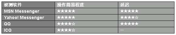 MSN Messenger和Yahoo! Messenger的操作都很簡單,只是MSN Messenger在同樣的畫質下延遲要小于Yahoo! Messenger,表現(xiàn)出更優(yōu)的實用性。QQ操作也不算太復雜,只是會員和非會員在功能上有一些限制,不過在同畫質的延遲方面做的算是出色,ICQ操作沒有測試成功。