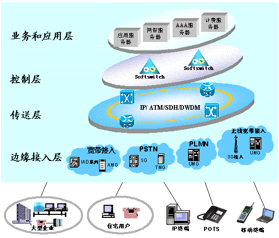 d)邊緣接入層:由各類媒體網(wǎng)關和綜合接入設備(IAD)組成,通過各種接入手段將各類用戶連接至網(wǎng)絡,并將信息格式轉換成為能夠在分組網(wǎng)絡上傳遞的信息格式。
