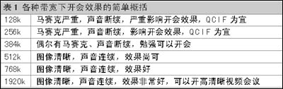 表1各種帶寬下開會效果的簡單概括