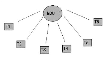 就H.323來講,企業(yè)存在ADSL、電信專線、衛(wèi)星網(wǎng)絡(luò)等多種選擇。H.323基于IP網(wǎng)絡(luò),IP網(wǎng)絡(luò)雖然是總線型的網(wǎng)絡(luò),但從H.323視頻會議系統(tǒng)組網(wǎng)來說,依舊同H.320視頻會議系統(tǒng)一樣,是星型網(wǎng)絡(luò),如圖所示,所有的終端數(shù)據(jù)都匯集到MCU處。這樣對視頻會議系統(tǒng)組網(wǎng)就提出了要求,如果MCU以下共有6個終端,每個中端以B的帶寬開會,那么各個終端處的帶寬要求為B,MCU處的帶寬要求就為6B。