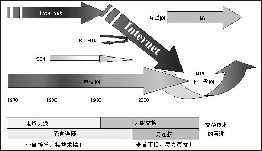傳統(tǒng)電信網(wǎng)和互聯(lián)網(wǎng)都面臨著挑戰(zhàn),基于電話業(yè)務(wù)設(shè)計(jì)的電路交換網(wǎng)不能靈活適應(yīng)帶寬各異的數(shù)據(jù)業(yè)務(wù)的發(fā)展。專為數(shù)據(jù)業(yè)務(wù)設(shè)計(jì)的互聯(lián)網(wǎng)則存在著安全性、可管理性、商業(yè)模式等問題的困擾。NGI對目前電信網(wǎng)的主要盈利業(yè)務(wù)語音的質(zhì)量保證以及對電信網(wǎng)增長空間很大的業(yè)務(wù)(移動)關(guān)注不夠。NGI可能達(dá)到的目標(biāo)不能滿足電信界的需要。因此,在NGI之后ITU和ETSI等提出了更高的目標(biāo)——NGN,這就是NGN的提出背景。信息產(chǎn)業(yè)部電信研究院科技委副主任委員雷震洲認(rèn)為,兩大亮點(diǎn)點(diǎn)燃了NGN:一是數(shù)據(jù)超過語音的信息需求,全球互聯(lián)網(wǎng)用戶目前已逾7億,全世界在網(wǎng)上傳送的以IP為代表的數(shù)據(jù)業(yè)務(wù)量已經(jīng)超過語音業(yè)務(wù)量;二是移動超過固定的個(gè)性化需求,全球移動用戶已經(jīng)超過13億,近100個(gè)國家的移動用戶數(shù)已經(jīng)超過固定用戶數(shù),我國在2003年10月移動用戶也超過了固定用戶數(shù)。