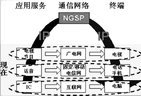 完全融合方式 完全融合的典型技術解決方案是目前業(yè)界普遍關注的焦點—NGN(下一代網絡)。NGN的核心思路是重新生產和建立符合標準的服務、網絡和終端,徹底取代原有相對獨立的應用服務、通信網絡和終端。由于技術標準制定復雜,網絡設備投資巨大,實施周期過長等因素,實現起來困難較大。