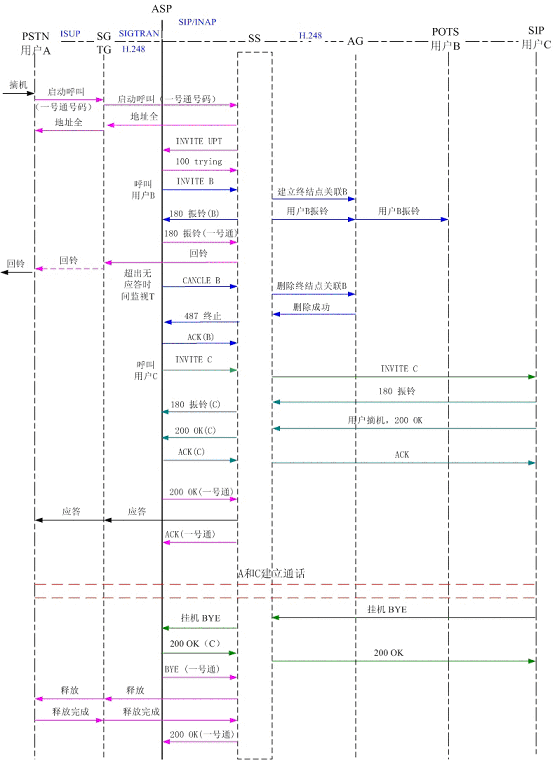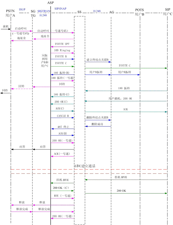 圖4為PSTN用戶A撥打一號(hào)通用戶,同振到軟交換域AG下POTS用戶B和SIP用戶C,其中軟交換和應(yīng)用服務(wù)器以SIP協(xié)議相連,軟交換和AG、軟交換和TG以H.248協(xié)議相連?梢钥吹剑脩鬊和用戶C同時(shí)振鈴,用戶C摘機(jī)應(yīng)答,應(yīng)用服務(wù)器取消了對(duì)用戶B的振鈴。雙方通話,通話結(jié)束,用戶C掛機(jī),系統(tǒng)釋放了連接。