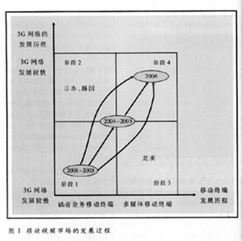 移動(dòng)網(wǎng)絡(luò)和移動(dòng)終端的發(fā)展將共同決定移動(dòng)視頻市場(chǎng)的發(fā)展進(jìn)程,主要包括四個(gè)發(fā)展階段,見圖1。