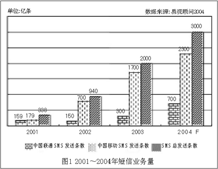 預(yù)計(jì)2004年的短信發(fā)送量將達(dá)到3000億條,其中中國(guó)移動(dòng)為2300億條,中國(guó)聯(lián)通為700億條,具體如圖1所示。并且,隨著用戶逐漸習(xí)慣使用SMS業(yè)務(wù),SMS用戶數(shù)占手機(jī)用戶數(shù)的比例會(huì)略有增加。