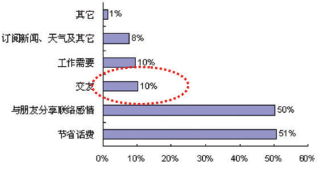 首先從使用目的看,我們的調(diào)查研究表明,大部分用戶使用短信最主要的目的是節(jié)省話費(fèi),該類用戶比例高達(dá)51%; 其次是與朋友分享,以及聯(lián)絡(luò)感情,比例為50%; 而其他如交友、工作需要、訂閱新聞、天氣及其他等所占比例較低,均不超過(guò)10%。由此可見(jiàn),雖然短信業(yè)務(wù)已經(jīng)深入地滲透了用戶的生活,但是用戶的主要應(yīng)用仍然是點(diǎn)對(duì)點(diǎn)的應(yīng)用,信息類的應(yīng)用只占很小的部分(見(jiàn)圖2)。