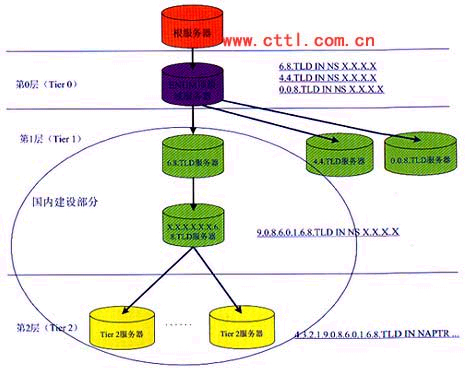 (1)第0層對應(yīng)于ENUM的根域,在這一層中只有一個域,比如e164.tld。第0層的域名服務(wù)器中包含的記錄指向ENUM第1層的域名服務(wù)器。