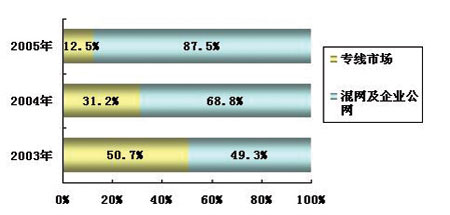 2004年,基于專線網(wǎng)絡(luò)的視頻會議系統(tǒng)與基于混網(wǎng)和企業(yè)公網(wǎng)的產(chǎn)品比例發(fā)生了轉(zhuǎn)折性變化,基于混網(wǎng)和企業(yè)公網(wǎng)的產(chǎn)品占到了68.8%的比例,成為了市場主流。計世資訊(CCW Research)研究表明:2005年,這一趨勢更趨明顯,基于混網(wǎng)和企業(yè)公網(wǎng)產(chǎn)品的比例將高達87.5%。