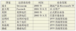 歐洲電信運營商在部署IPTV時,主要采用三重服務(triple-play)業(yè)務模式占領(lǐng)市場。該業(yè)務模式有助于電信運營商與有線電視運營商的競爭。目前,歐洲電信運營商已準備或開始IPTV的商業(yè)化進程。