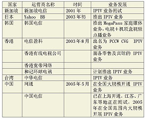 1999年,英國Video Networks公司率先在全球推出了IPTV業(yè)務,此后,國外許多電信運營商先后進入IPTV市場。但在2004年之前,多數(shù)運營商僅側(cè)重于IPTV的試驗,2004年后,IPTV開始從試驗階段向商用階段轉(zhuǎn)變,許多業(yè)界人士認為,2005年將成為IPTV年。