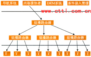 IPTV業(yè)務提供者可以根據用戶的請求,利用IP網絡本身所提供的組播能力將視頻信息以組播的方式傳送給用戶。此時,同時向相同的業(yè)務提供者請求發(fā)送相同內容信息的用戶,可以由業(yè)務提供者安排在同一個組播組中接收到相同的信息。為給內容提供者提供知識產權保護,業(yè)務提供者提供條件接入控制。同時為減少骨干網絡傳輸的壓力,業(yè)務提供者在向眾多的用戶提供組播式業(yè)務時可以利用多級組播的形式來實現。組播式IPTV業(yè)務可能的系統(tǒng)模型示意如圖1所示。
