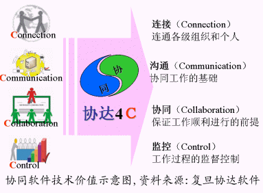 V4.0 ,協(xié)同軟件圍繞著構(gòu)建網(wǎng)上虛擬工作場所,在IT應(yīng)用上所體現(xiàn)的價(jià)值,主要是4C,即:"連接Connection、溝通Communication、協(xié)作Collaboration、監(jiān)控Control",這也是協(xié)同軟件的主要IT技術(shù)價(jià)值的體現(xiàn)。