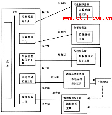 在DAVIC1.5AnytimeAnywhere文件中所規(guī)定的模型如圖2所示。在該圖中沒有描述任何與網絡相關的內容。僅規(guī)定出在客戶端設備和服務器端設備中應當包含的功能模塊。即:元數據服務、位置解析、版權管理和保護、本地存儲控制、媒體服務。其基本思想為,在服務器端提供的所有功能。在客戶端設備中應包含有相關的軟件工具。在業(yè)務的具體實施過程中,客戶端首先向服務器端請求幫助查找其感興趣的媒體內容,由元數據服務器處理并返回相關信息。通過位置解析服務器來確定客戶端所選擇的媒體內容所在的位置;經過媒體管理和保護服務器的認可:由本地存儲服務器向用戶提供媒體信息同時允許客戶端對媒體信息進行控制。