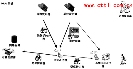 如圖4所示,DRM系統(tǒng)主要負責將內容發(fā)布者發(fā)布的信息與版權發(fā)布者發(fā)布的信息組合起來將內容變?yōu)槭鼙Wo的內容,由版權客體提供使用規(guī)則,用戶在使用內容時需要首先從DRM代理處根據使用規(guī)則獲得使用受保護內容的密鑰,然后使用所獲得的密鑰對受保護的內容進行解碼并使用。