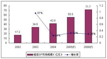 繼2004年中國(guó)政府和運(yùn)營(yíng)商監(jiān)管力度的加大,2005年的短信SP市場(chǎng)規(guī)模增長(zhǎng)率為32%,SP市場(chǎng)規(guī)模55.5億元,比2004年略有上升;谀壳岸绦攀袌(chǎng)增量市場(chǎng)的縮小,其增長(zhǎng)主要依靠對(duì)存量市場(chǎng)需求的深度挖掘。諾盛預(yù)計(jì)2006年的短信市場(chǎng)繼續(xù)保持平穩(wěn)的增長(zhǎng)勢(shì)頭,增長(zhǎng)率將達(dá)29%。