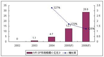 由于運(yùn)營(yíng)商的監(jiān)管和增量市場(chǎng)需求的減少,2005年IVR高速增長(zhǎng)的勢(shì)頭有所回落,市場(chǎng)增長(zhǎng)速度趨于理性,SP市場(chǎng)份額增長(zhǎng)率為170%,整體SP市場(chǎng)份額達(dá)到12.7億元。諾盛預(yù)計(jì)2006年IVR市場(chǎng)增長(zhǎng)率將繼續(xù)回調(diào),但絕對(duì)增長(zhǎng)率仍然較快,達(dá)到125%。