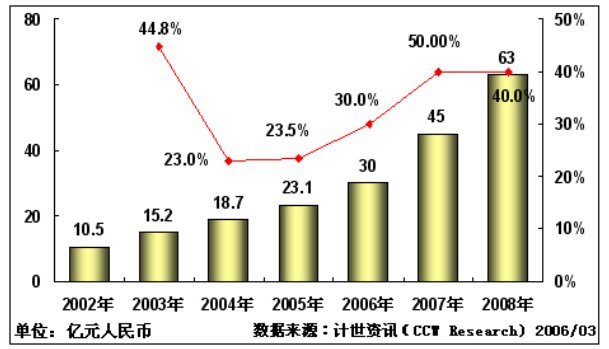 計世資訊(CCW Research)預測認為,2006年和2007年視頻會議市場將以30%和50%的增長率飛速增長。市場規(guī)模分別達到30億和45億人民幣。而2008年隨著奧運建設的告一段落,整個市場將進入一個消化調(diào)整期,市場發(fā)展速度則逐步開始放慢。