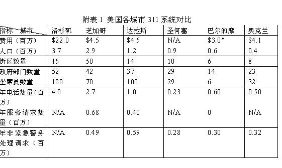 附表1是美國部門城市311系統(tǒng)建設(shè)運(yùn)營的相關(guān)數(shù)據(jù)(為2002年數(shù)據(jù)),從表中可以看出美國311的一些基本情況。