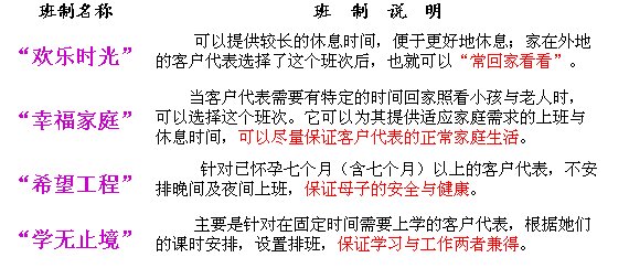 通過流程優(yōu)化,可以大大提高組織的運(yùn)營效率和工作質(zhì)量,如:我們通過對員工排班流程的優(yōu)化,大大提高了客戶服務(wù)中心人員的利用效率、服務(wù)質(zhì)量,同時(shí),還提高了員工滿意度。我們通過對流程中第3、4、5步工作方法的改進(jìn),大大提高了人員利用率,且提高幅度達(dá)20%以上。同樣,通過對第6步班次設(shè)置的改進(jìn),實(shí)施了個(gè)性化的班次設(shè)置(見表2),如:針對喜歡有整天休息時(shí)間,及家在外地的客戶代表,設(shè)置了“歡樂時(shí)光”輪班,為大家提供較長的休息時(shí)間,如兩天以上的連休,便于回家與更好地休息;針對家里有小孩子或老人、需在固定時(shí)間回家的客戶代表,設(shè)置了“幸福家庭”輪班,為他們提供適應(yīng)家庭需求的上班與休息時(shí)間,盡量保證員工的正常家庭生活;針對已懷孕及哺乳期的客戶代表,設(shè)置了“希望工程”輪班,不安排晚間及夜間上班,保證了母子的安全與健康;針對在固定時(shí)間需要上學(xué)的客戶代表,設(shè)置了“學(xué)無止境”輪班,主要是根據(jù)她們的課時(shí)安排設(shè)置排班,保證學(xué)習(xí)與工作兩者兼得。這種做法大大加強(qiáng)了員工積極性,并提高了員工的滿意度。