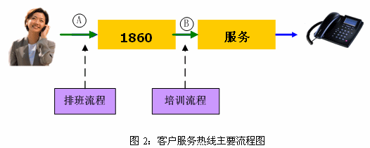 因此,根據(jù)客戶服務(wù)中心的實際情況,我們首先優(yōu)化了排班流程,建立并優(yōu)化了培訓(xùn)流程。我們首先選擇這兩個流程的思路如下:從客戶角度來看,10086熱線在接受用戶咨詢服務(wù)時的主要流程如下:撥號→1860→服務(wù)提供→掛機(jī)。圖示如下: