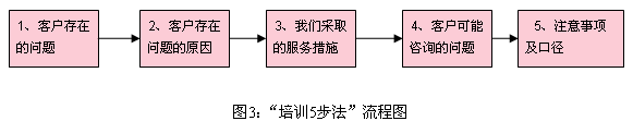 我們要求所有培訓(xùn)課件都按“客戶存在的問題→客戶存在問題的原因→我們采取的服務(wù)措施→客戶可能咨詢的問題→注意事項及口徑”這五步進(jìn)行編纂。各步驟含義說明如下: