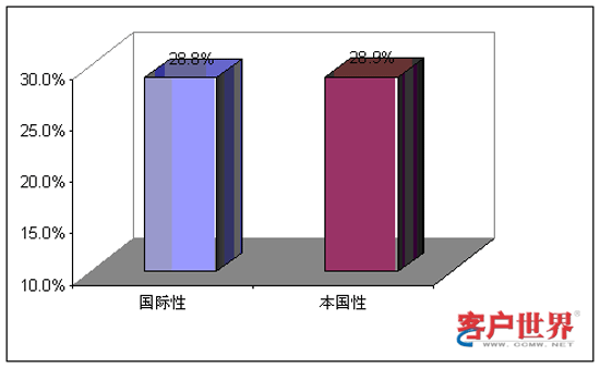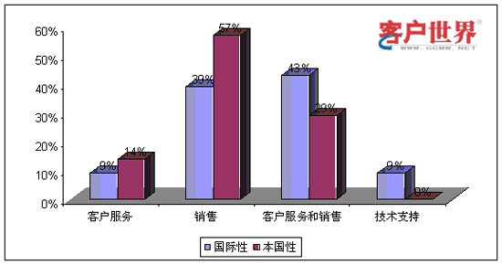 從業(yè)務(wù)功能看來,國(guó)際性呼叫中心和本國(guó)性呼叫中心承擔(dān)著不同的角色。9%的國(guó)際性呼叫中心和14%的本國(guó)性呼叫中心提供僅限于客戶服務(wù),例如賬號(hào)查詢和催費(fèi)收款。39%的國(guó)際性呼叫中心和59%的本國(guó)性呼叫中心專門展開網(wǎng)上營(yíng)銷和銷售(外撥為主)。43%的國(guó)際性呼叫中心和29%的本國(guó)性呼叫中心同時(shí)承擔(dān)客戶服務(wù)和銷售功能。最后,我們調(diào)查到9%的國(guó)際性呼叫中心專門從事技術(shù)支持,而且這些中心專門為國(guó)際市場(chǎng)設(shè)立。服務(wù)功能上的差異會(huì)對(duì)商業(yè)定位和人力資源管理提出不同的要求。