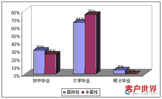 總的而言,參加調(diào)研的呼叫中心雇用的員工接受了平均15年的正式教育,也就是大學(xué)畢業(yè)的一般水平。國(guó)際性和本地型呼叫中心在勞動(dòng)力的受教育水平上沒有呈現(xiàn)明顯差異。其中,30%的國(guó)際性和25%的本國(guó)性呼叫中心大量雇用初中畢業(yè)程度(12年教育)的員工;65%的國(guó)際性和75%的本國(guó)性呼叫中心雇用高中畢業(yè)程度(15年教育)的員工;此外,5%的國(guó)際性呼叫中心,往往是提供技術(shù)支持服務(wù),主要雇用碩士畢業(yè)水平(17年教育)的員工。