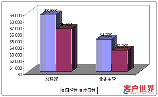管理人員的薪酬水平明顯高于一線人員的薪酬水平。呼叫中心總經(jīng)理的年收入達(dá)到$8,194,其中在國(guó)際性呼叫中心為$8,638而在本地性呼叫中心為$6,514。對(duì)于業(yè)務(wù)主管來說,平均年工資為$4,253,其中在國(guó)際性呼叫中心$4,935而在本地性呼叫中心$3,256。