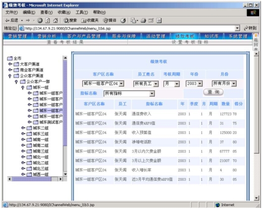作為電信營銷服務(wù)支撐系統(tǒng),其主要功能是支撐營銷人員開展?fàn)I銷活動,并通過功能完善的考核系統(tǒng)幫助各級人員進行工作管理。本系統(tǒng)可以對KPI指標進行靈活的設(shè)定,可以靈活定義多種參與考核的數(shù)據(jù)來源,使得各級主管能夠?qū)蛻艚M、社區(qū)(商業(yè)客戶區(qū)、農(nóng)村統(tǒng)包區(qū))的營銷服務(wù)工作進行考核評分?己酥芷诳梢酝ㄟ^參數(shù)進行設(shè)定(一般以月為單位)。