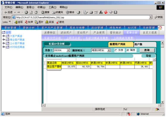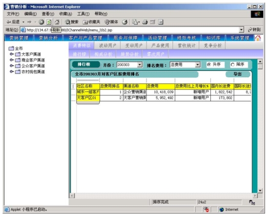 本系統(tǒng)是以市場為導(dǎo)向、客戶為中心、效益為目標的電信營銷和服務(wù)的支撐系統(tǒng),為企業(yè)經(jīng)營服務(wù)和營銷戰(zhàn)略提供有力的支撐,通過對業(yè)務(wù)收入、業(yè)務(wù)發(fā)展以及市場競爭的深入分析,從而達到留住老客戶、發(fā)現(xiàn)新客戶,了解競爭對手動態(tài),及時掌握市場變化趨勢的目的。