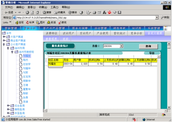 本系統(tǒng)通過對本地計費帳務(wù)系統(tǒng)、網(wǎng)間結(jié)算系統(tǒng)、1000號客戶服務(wù)系統(tǒng)、“九七工程”系統(tǒng)、資源管理系統(tǒng)的動態(tài)相關(guān)數(shù)據(jù)的提取,按日(天)記錄并分析開展?fàn)I銷服務(wù)工作所需的客戶基本資料、客戶關(guān)系資料、客戶收入信息、客戶消費行為信息、客戶變動信息、客戶障礙信息、客戶投訴信息、客戶競爭動態(tài)信息等支撐信息,指導(dǎo)各類客戶經(jīng)理開展有針對性營銷服務(wù)工作。
