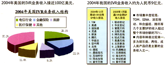 目前,國內(nèi)IVR的業(yè)務(wù)主要集中于為個(gè)人提供服務(wù)上,行業(yè)應(yīng)用所占比例較小,與成熟的國外市場(chǎng)以行業(yè)應(yīng)用為主的現(xiàn)狀形成巨大反差。而且,在為個(gè)人提供的語音業(yè)務(wù)中,國內(nèi)最受歡迎的仍是娛樂信息類中的聊天交友類業(yè)務(wù),這表明國內(nèi)個(gè)人用戶的需求層次較低;其次是娛樂和點(diǎn)播類的音樂類業(yè)務(wù);第三大類是游戲答題類,例如:知識(shí)競(jìng)猜、有獎(jiǎng)競(jìng)猜、角色扮演游戲、互動(dòng)游戲等;另外,IVR的數(shù)據(jù)業(yè)務(wù),如:短信、彩鈴、彩信等,受到近兩年國內(nèi)短信、彩鈴業(yè)務(wù)蓬勃發(fā)展的帶動(dòng),近兩年也呈現(xiàn)快速增長的良好勢(shì)頭。