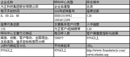 方正呼叫中心是方正服務(wù)平臺(tái)的重要組成部分,1999年建立,秉承了北大方正“勤備、嚴(yán)謹(jǐn)、求實(shí)、創(chuàng)新”的精神,依托方正科技“誠(chéng)信、創(chuàng)新、客戶導(dǎo)向、全局觀念、主動(dòng)高效、追求目標(biāo)和賞罰分明”的核心價(jià)值觀,以及“全程服務(wù)”的品牌文化,以“優(yōu)化服務(wù)流程,提高服務(wù)質(zhì)量,培育優(yōu)秀品牌,形成競(jìng)爭(zhēng)優(yōu)勢(shì),創(chuàng)新服務(wù)模式,加速業(yè)務(wù)增長(zhǎng)”作為自己的發(fā)展目標(biāo)和方向,并學(xué)習(xí)業(yè)界先進(jìn)的理念和方法,不斷探索和發(fā)展,多次受到媒體和機(jī)構(gòu)的關(guān)注。